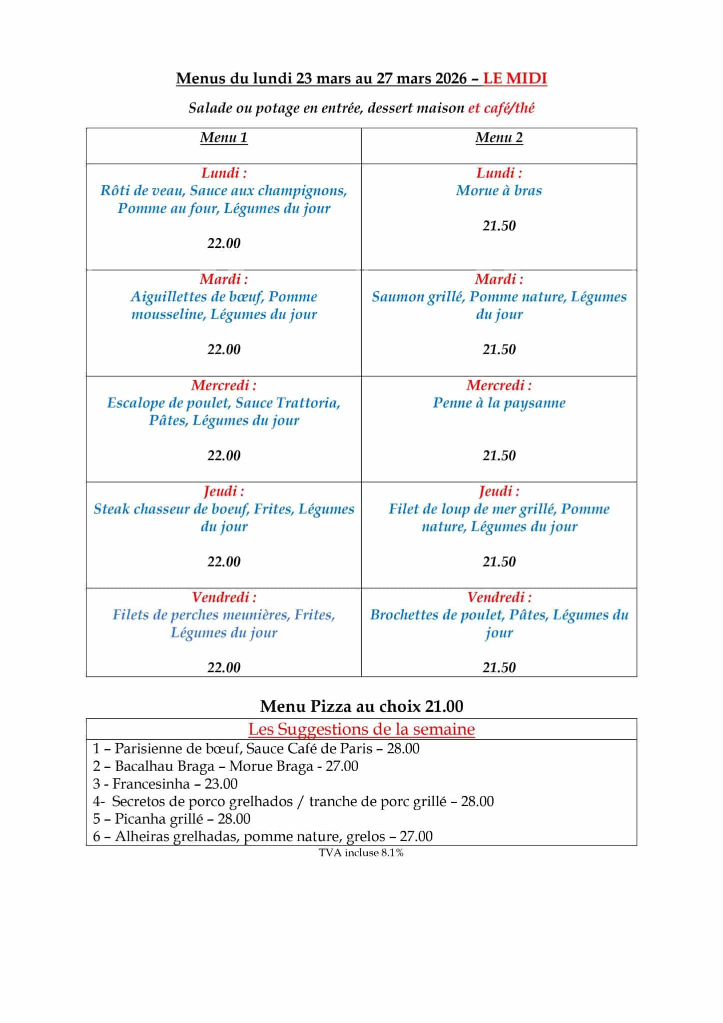 Consultez ci-dessus notre menu de la semaine et réservez votre table dès aujourd’hui pour profiter d’une cuisine qui allie fraîcheur, qualité et générosité au cœur de Renens.